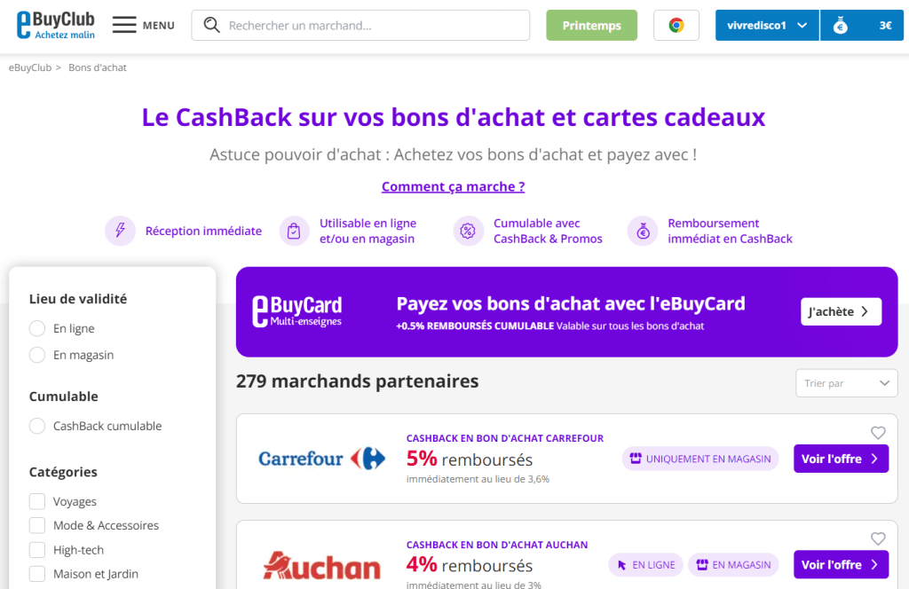Ce qui donne encore l’avantage d’eBuyClub c’est la possibilité d’acheter des bons d’achats à dépenser dans de grands magasins comme Ikea, Carrefour et Intermarché. Pour être clair, si j’achète un bon d’achat Décathlon à 50 euros, vous avez droit à 3% dans votre cagnotte eBuyClub ce qui équivaut à 1,50€. Une petite somme, mais cumuler à d’autres vous permet de gagner en pouvoir d’achat. Les bons d’achat commandés sont disponibles immédiatement et vous sont envoyés par mail. Comme iGraal et Poulpeo, eBuyClub propose une application compatible Android et Apple sans oublier l’extension de navigateur indispensable.