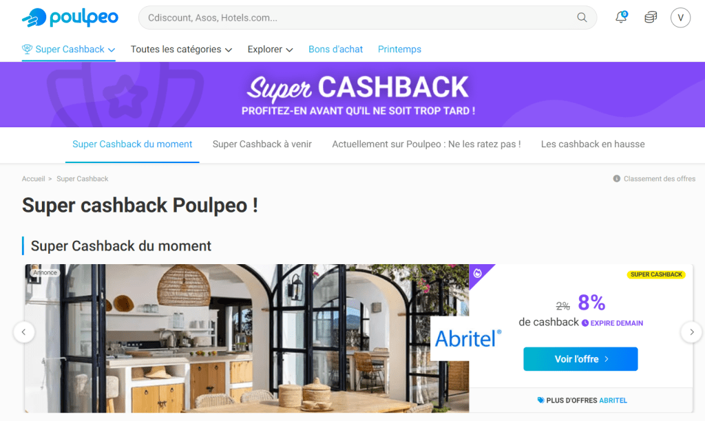 Poulpeo fonctionne sur le même modèle qu’iGraal en regroupant de nombreuses offres de cashback par catégories. Pour maximiser vos gains, vous pouvez installer son extension dédiée sur Chrome ou Firefox, ou utiliser l’application mobile compatible avec Android et Apple.
