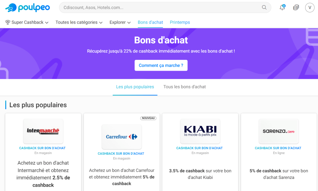 Le principe du cashback sur bons d’achat chez Poulpeo est une méthode simple et instantanée pour économiser sur vos dépenses quotidiennes. Concrètement, vous achetez une carte cadeau du montant de votre choix pour une enseigne partenaire, comme Carrefour ou IKEA, directement sur la plateforme. Contrairement au cashback classique, le remboursement est crédité immédiatement sur votre cagnotte dès le paiement du bon, avant même que vous ne l’utilisiez.