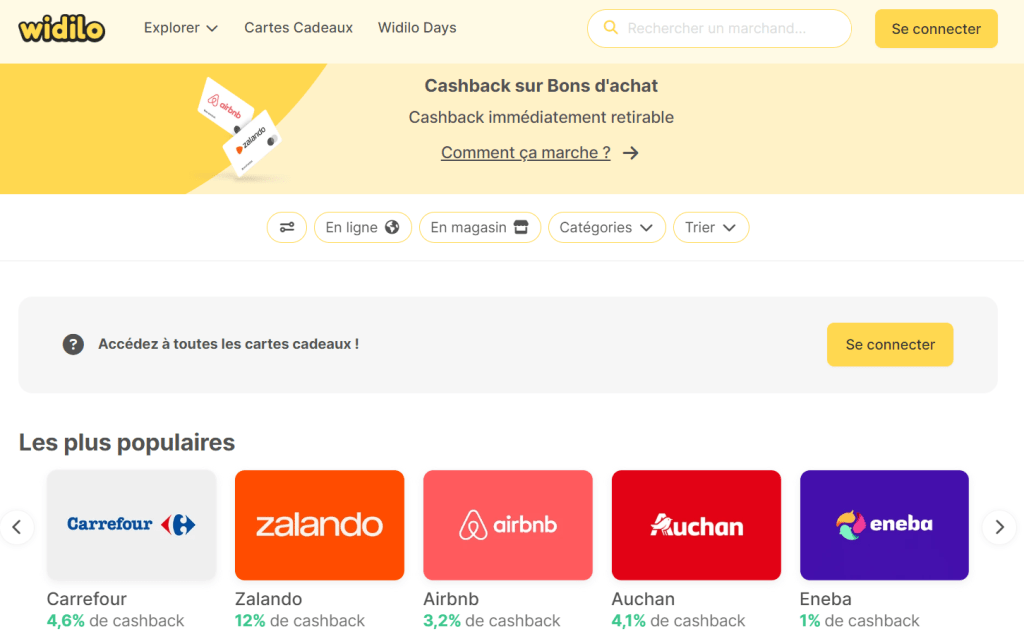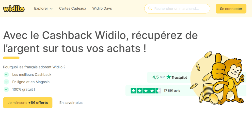 Widilo remplit aussi les caractéristiques d’un bon site de cashback en proposant un tas d’offres intéressantes classées par catégories (Voyages, Mode, Beauté, High-Tech, Maison, Sports, Abonnements…). Pour profitez de taux cashback encore plus avantageux, il faut accéder à la rubrique « Hot deals ».