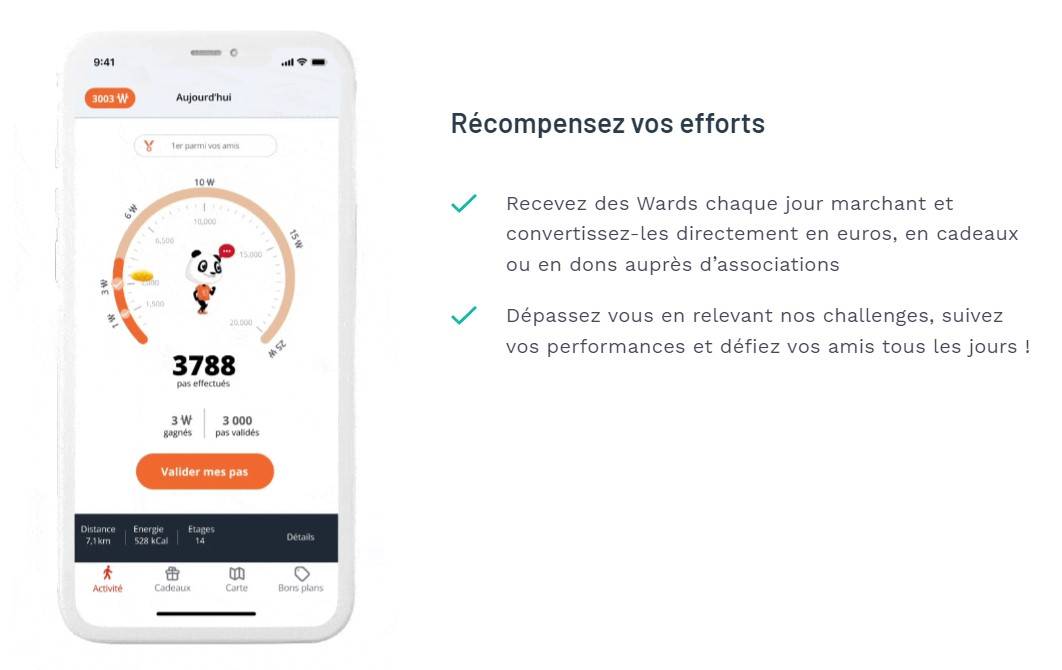 La méthode est simple : marchez, gagnez, donnez, progressez, découvrez et amusez-vous ! L’application calcul précisément vos pas à l’aide du compteur de pas de votre application santé et vous pouvez accumuler des Wards à chaque pas effectué. Convertissez ensuite vos Wards en récompenses, en bons de réduction ou en euros directement sur votre compte bancaire. Vous pouvez même décider de donner vos Wards à des associations pour soutenir des projets humanitaires, éducatifs, écologiques et inclusifs.