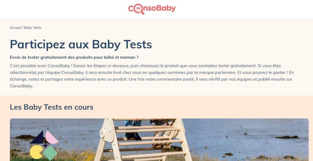 En vous inscrivant sur le site communautaire Consobaby, vous pouvez comme son nom l’indique tester gratuitement des produits dédiés aux bébés. Au préalable, pour candidater aux campagnes de test, vous devez écrire 5 avis sur consobaby.com sur ce que vous utilisez habituellement avec votre bébé (poussette, siège auto, alimentation, biberon, etc.). Appliquez-vous pour les rédiger afin d’être sélectionné plus tard aux campagnes de test. Pour vous inscrire en tant que testeur chez Consobaby, veuillez cliquer sur ce lien : consobaby.com/baby-tests.
