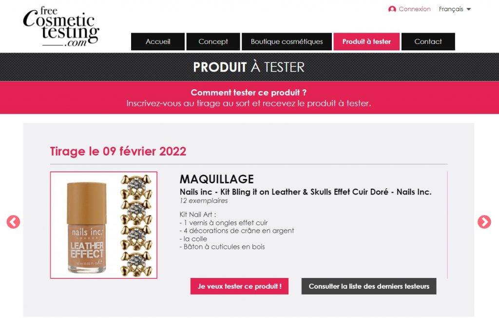 En devenant membre sur le site free-cosmetic-testing.com, vous pouvez recevoir à votre domicile des produits de beauté gratuits à tester. Vous pouvez également répondre à des enquêtes en échange de points qui peuvent être convertibles contre des produits gratuits (rouge à lèvres, crayon à lèvres, crème illuminatrice, etc.).