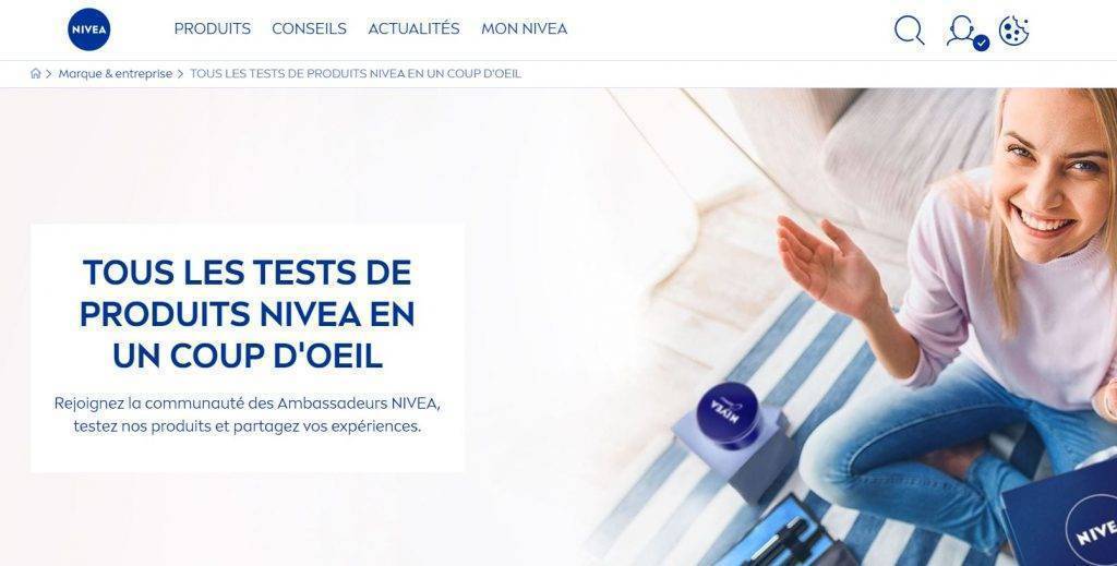Nivea propose également un programme (NIVEA Loves You) qui vous permet de tester leurs produits gratuitement. Une fois inscrit à ce programme, il suffit de compléter correctement son profil membre pour avoir peut-être la chance d’être sélectionné lors d’une campagne. Après avoir testé le produit, vous aurez comme contrepartie d’écrire un avis sur nivea.fr. Pour vous inscrire en tant que testeur des produits Nivea, veuillez cliquer sur ce lien : nivea.fr/marque-entreprise/test-produits