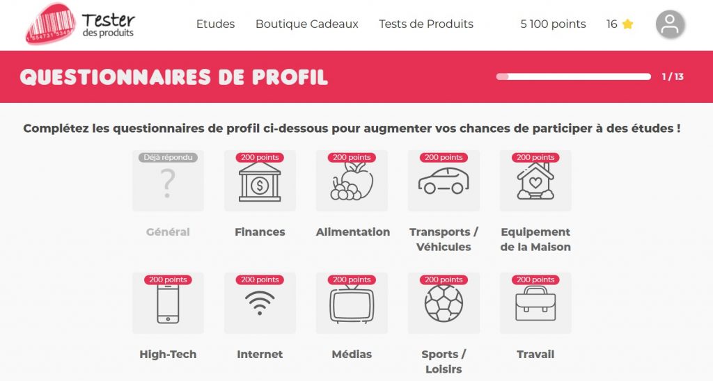 Je le rappelle encore une fois, mais il ne faut surtout pas oublier de compléter un maximum votre profil pour augmenter vos chances de participer à des études et à des tests de produits. Ce sont des informations essentielles permettant de sélectionner des profils appropriés. Répondez le plus sérieusement possible, car s’il y a des incohérences dans vos déclarations, votre candidature risque de passer à la trappe. Une fois votre inscription effectuée, veuillez cliquer sur ce lien pour compléter votre profil : testerdesproduits.fr/questionnaires-profil